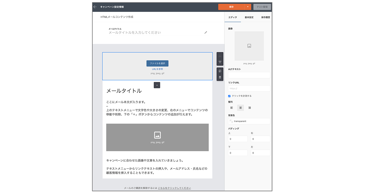 商品画像やボタンを自由に配置し、視覚的に魅力的なHTMLメールを作成できます。