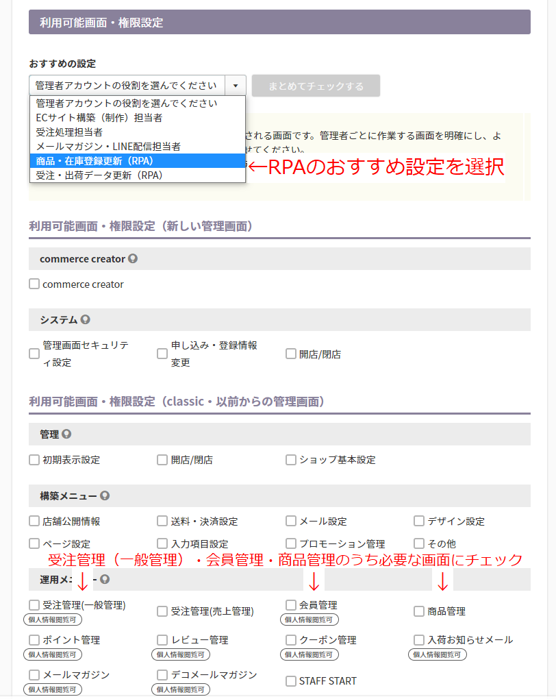 利用可能画面・権限設定では、受注管理(一般管理)・会員管理・商品管理のみチェックをつけてください。また、店舗管理者(スーパーユーザー)に設定できません。