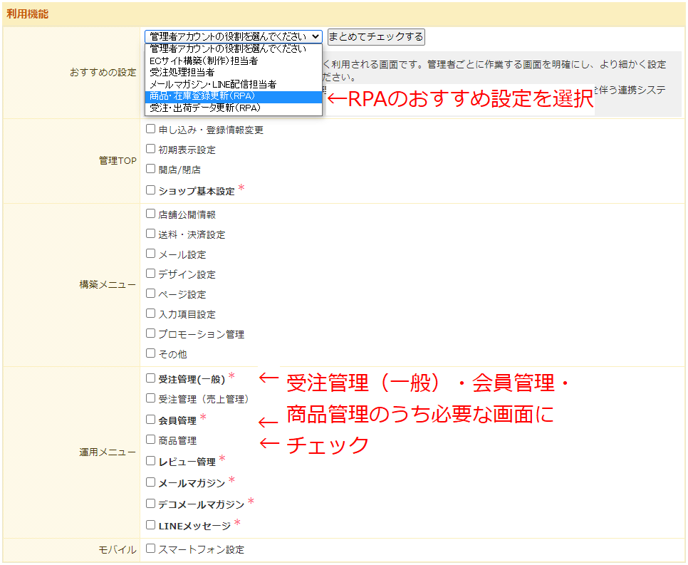 おすすめの設定から選択していただければ、RPAの役割ごとの利用機能の設定を一括チェックできます。