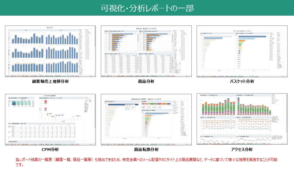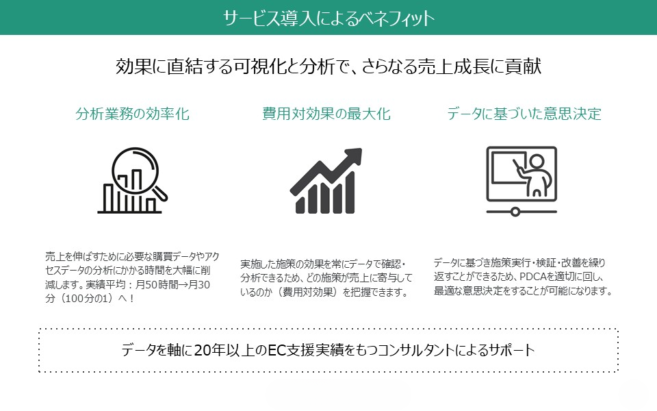 データドリブンEC支援サービスは、EC企業のデータドリブン経営を実現する伴走型コンサルティング支援です。顧客・商品・アクセスデータを統合したデータ分析できるダッシュボードを構築し、分析・施策立案・改善策を支援します。