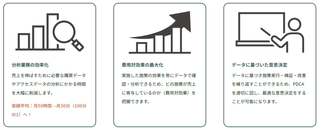 実施した施策の効果を常にデータで確認・分析でき、どの施策が売上に寄与しているのか把握できます。