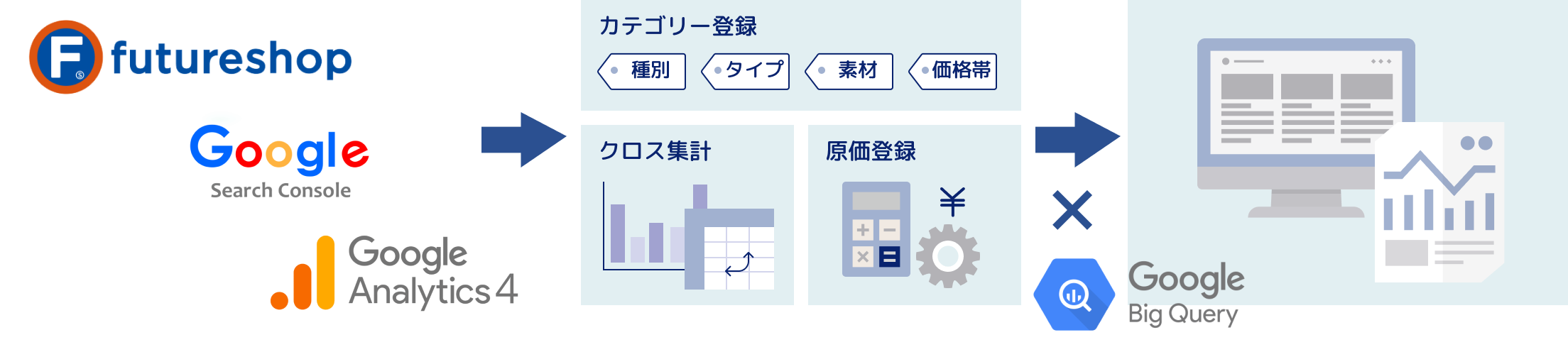 futureshopの実売データとGA4のデータを結合させ、1画面で売上とアクセスのデータが見れる