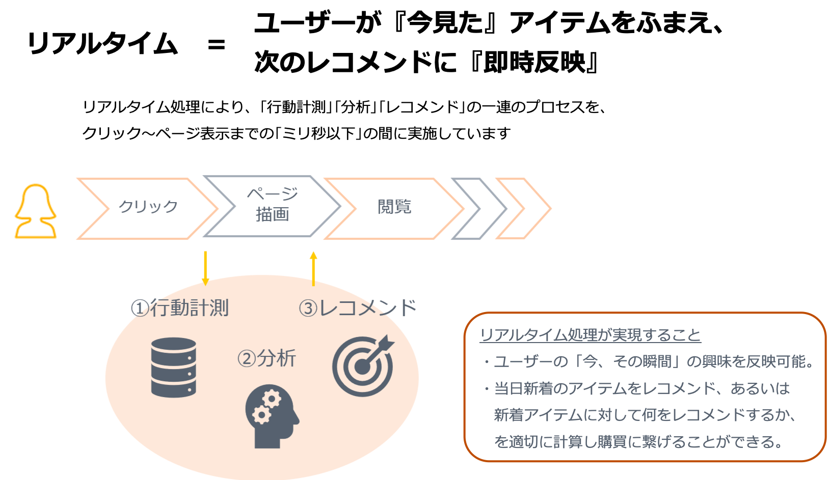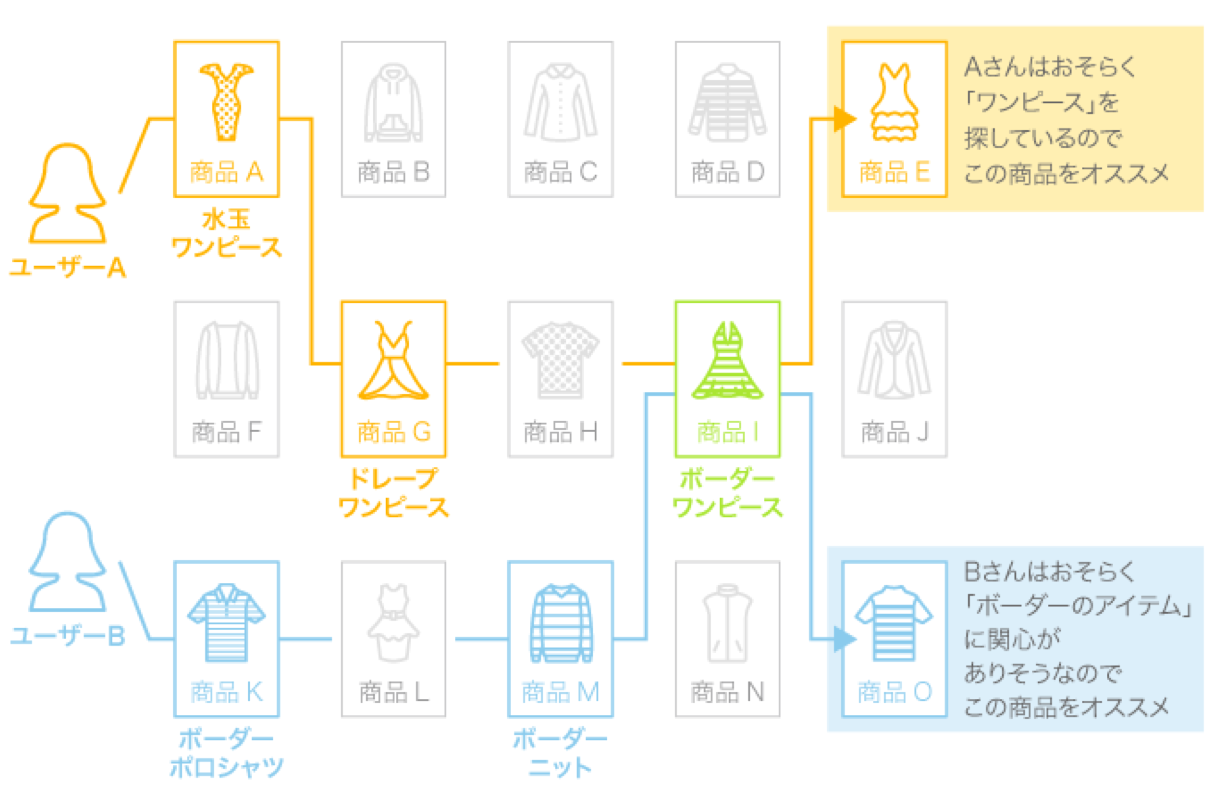過去から現在に至るユーザーひとりひとりの行動(閲覧、検索、CVなど)をリアルタイムに学習・解析し、「今、その瞬間」の興味を反映した最適なおすすめアイテムを予測し表示します。