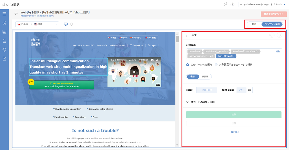 プレビュー機能で、実際に多言語化された画面を見ながら、翻訳を確認・編集することができます。 編集したいテキスト箇所や画像箇所をクリックするだけで編集が行えるため、直感的に作業を行うことができ、Webサイトに関するHTML/CSS等の知識がなくても簡単に利用することが可能です。
