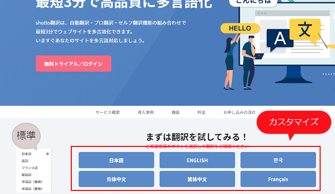 shutto翻訳は、国内外問わず言語の壁を越えた集客でCVを高めたいすべてのショップ様に対して、最短3分・JavaScriptのタグ1行で実装できるWebサイト多言語化ツールです。 自動翻訳・プロ翻訳・セルフ翻訳機能の組み合わせで、簡単・高品質にWebサイトを多言語化できます。