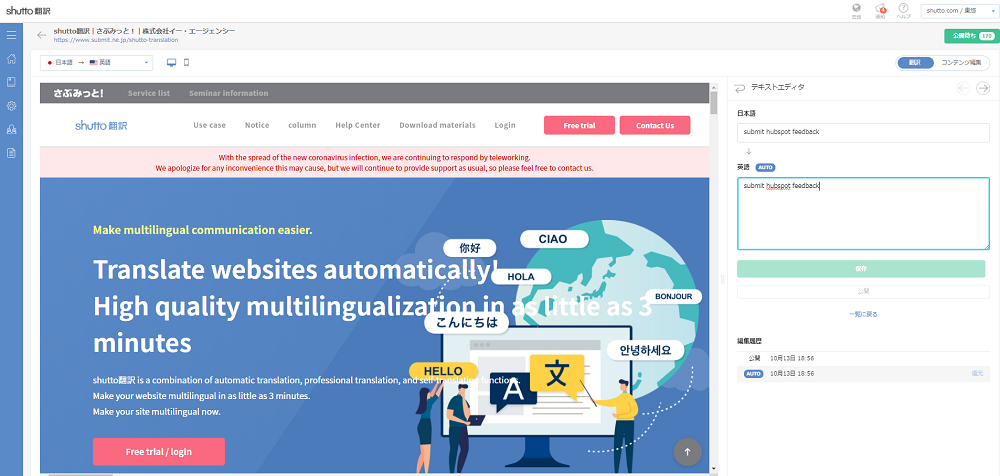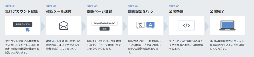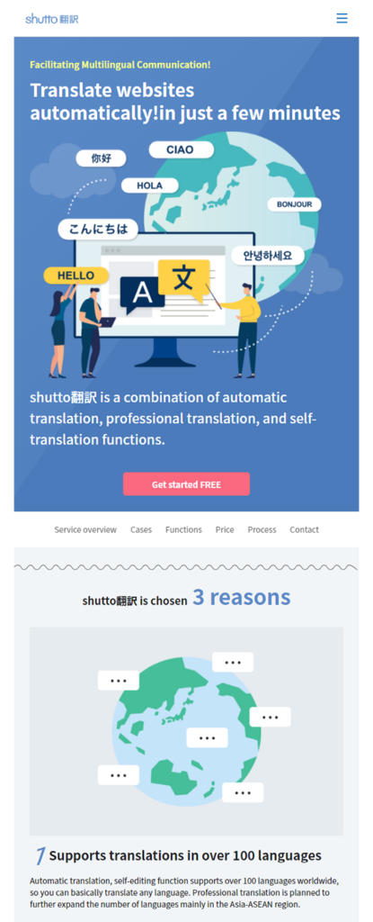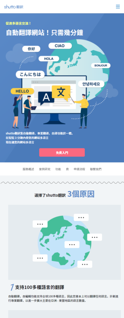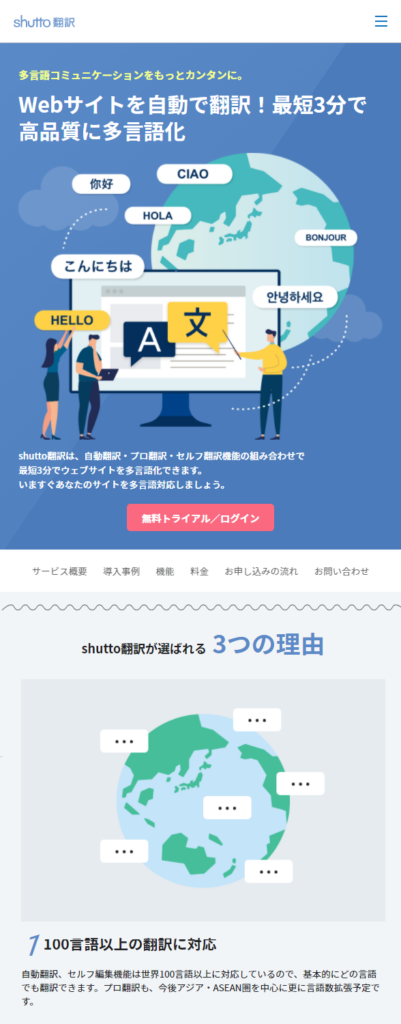 shutto翻訳は、国内外問わず言語の壁を越えた集客でCVを高めたいすべてのショップ様に対して、最短3分・JavaScriptのタグ1行で実装できるWebサイト多言語化ツールです。 自動翻訳・プロ翻訳・セルフ翻訳機能の組み合わせで、簡単・高品質にWebサイトを多言語化できます。