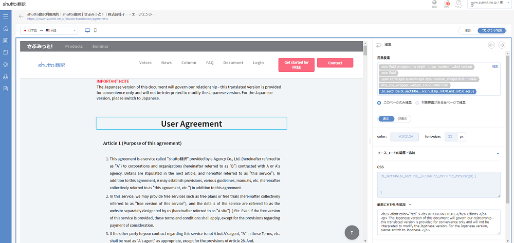 プレビュー機能で、実際に多言語化された画面を見ながら、翻訳を確認・編集することができます。 編集したいテキスト箇所や画像箇所をクリックするだけで編集が行えるため、直感的に作業を行うことができ、Webサイトに関するHTML/CSS等の知識がなくても簡単に利用することが可能です。
