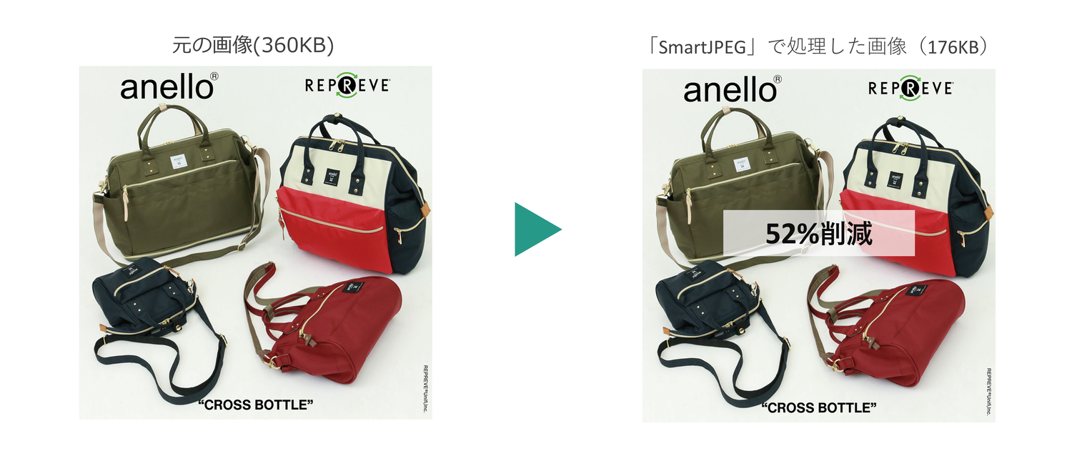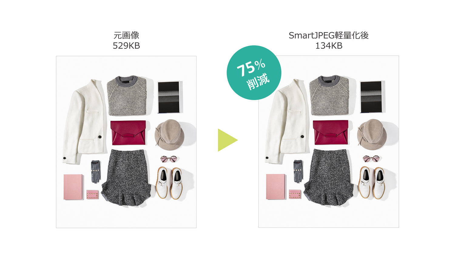「SmartJPEG」は画像の内容を判断し、最適化・軽量化をする画像圧縮エンジンを搭載しています。画質への影響度に合わせて自動で画像軽量化をすることで、ECサイトに必須と言われる”魅力を伝えるための商品画像”の画質と画像容量の両立を叶えます。大手ファッションECや画像投稿サービスなど、数多くの導入実績のある安心のクオリティをデスクトップ上のかんたん操作で作ることができます。