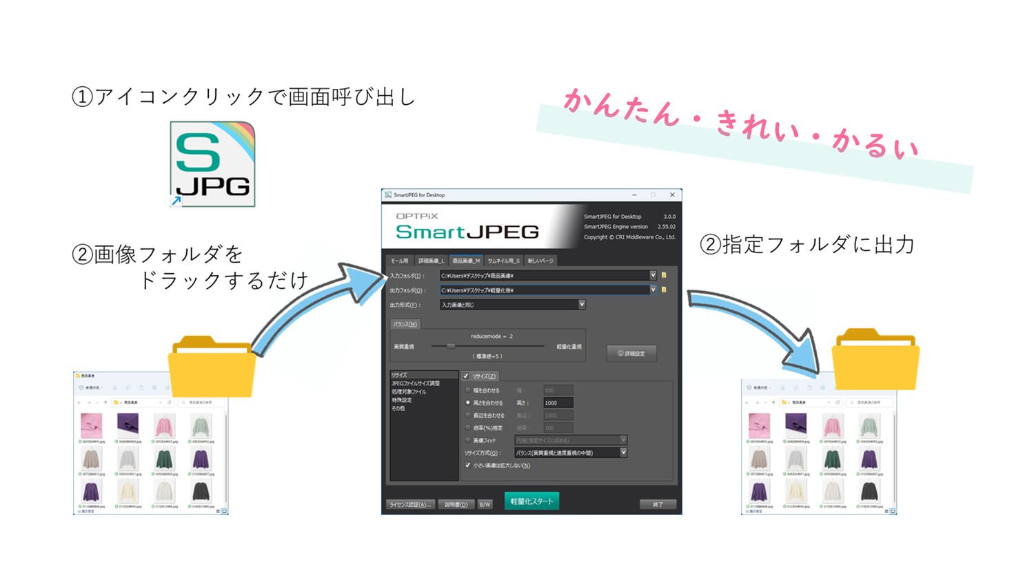 商品画像の作成、もっと速く・軽く・キレイに。「SmartJPEG for Desktop」は、商品画像の作成を効率化する画像軽量化ツールです。Windows・Macに対応したインストール型ソフトで、PC上で誰でもかんたんに使えます。画質を保ったまま画像を軽くできるため、商品の魅力はしっかり伝わり、サイトもサクサク快適になります。ファッション、インテリア、雑貨、コスメなど、 1700以上のブランドに導入されている安心の実績があります。