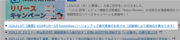 - 店舗様ごとの実施予定日は、futureshop管理画面トップのお知らせをクリックした確認用ページにてご確認いただけます。