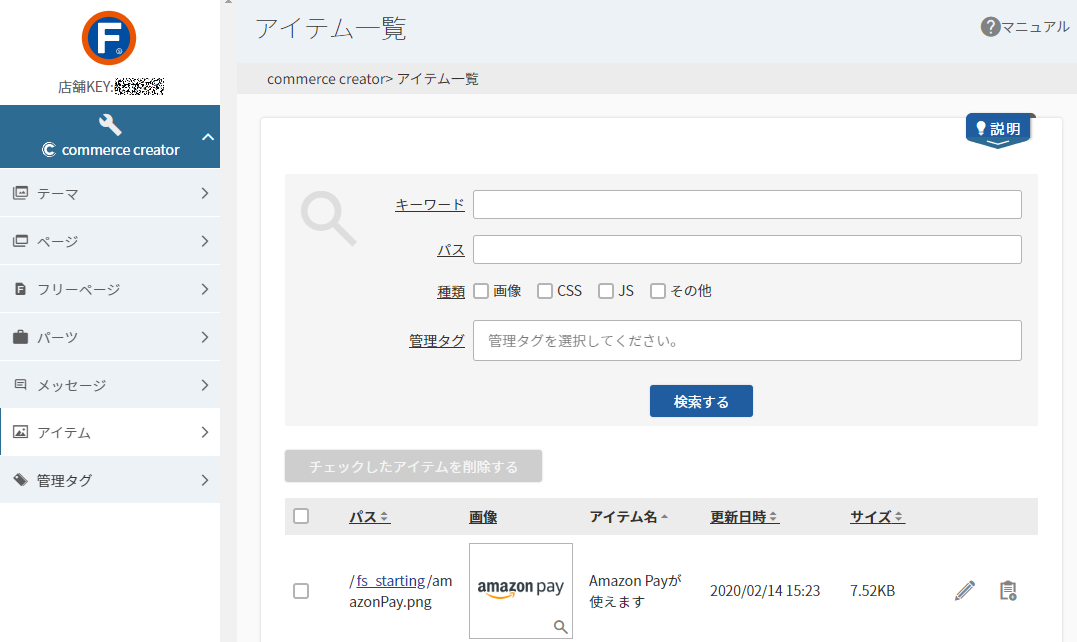 内のファイル、商品画像・商品グループ画像などが格納されております。commerce creator>アイテム 商品画像